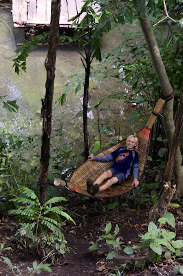 We were picked up from our hostel around 8:30, the driver was a little late but when he arrived we jumped into the big van with all of our bags. Our driver was wearing a fox hat, and since he was really tall, it looked like a fox was driving us. [Editor's note: Mom & Dad were cracking up during this drive as mom kept mouthing the words "WHAT DOES A FOX SAY?" While we found this quite funny, it apparently wasnt post-worthy in the teenage world]. It was about a two and a half hour drive and we stopped at a market along the way. The market was almost empty (the prime time to go is about 5:30am), but we observed some of the meat stalls before heading out to breakfast at a nearby bakery. After grabbing some banana bread, we drove for another hour before stopping at the Sticky Waterfall. Amazingly, this was actually one of the coolest waterfalls of the trip, it appeared as if a ton of large rocks were stacked on top of one another. The water was even warm. After the waterfall we drove for another half hour until we arrived at the treehouse. The treehouse wasn't quite ready when we arrived, so we had to wait for about 15 minutes while they were cleaning it. When it was ready we walked over a bridge that crossed a stream and then down a path for about fifteen more yards. Our treehouse was really close to the stream, so at night you could listen to the water gurgling. It was basically like a house on stilts, although there was one odd looking room at the very top. It wasn't massive, but it was plenty of space for two nights. There was one bed on the very top level, two in the middle, and one on the bottom. After we finished hauling all of our bags inside, us kids did homework, while mom and dad sat around a fire, and my sister played with another little girl from China. We did homework until about six, when it was time for dinner. For dinner we had fried fish, which was fantastic, along with sweet and sour chicken, and of course, rice. After dinner, we walked back to the treehouse. We all agreed that it was time for bed.